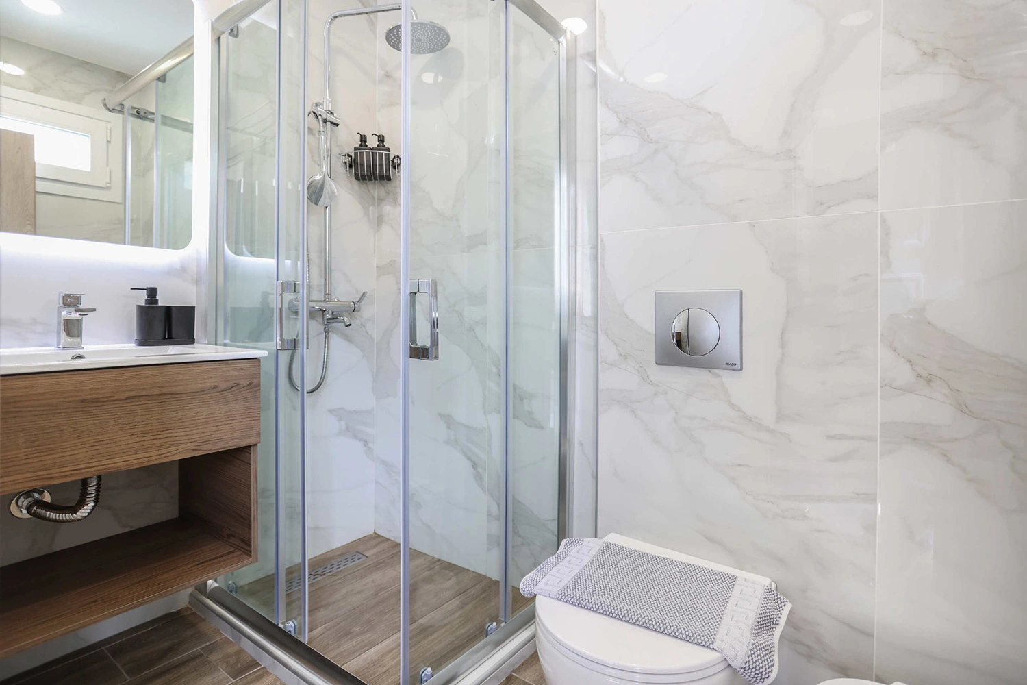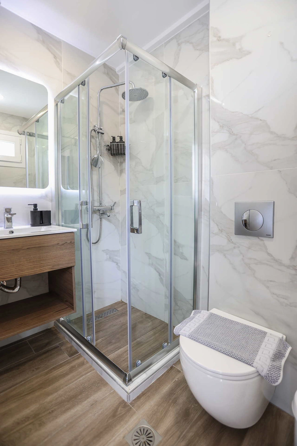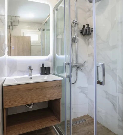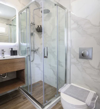 Ιδανικό για ζευγάρι, το δωμάτιο περιλαμβάνει ένα πολυτελές μπάνιο με καλλυντικά περιποίησης, φωτιζόμενο καθρέφτη και σύστημα μη θολότητας. Η τριπλή ντουζιέρα εξασφαλίζει πάντα ζεστό νερό για μία άνετη και χαλαρωτική εμπειρία. Το κατάλυμα παρέχει όλες τις ανέσεις για να απολαύσετε τις διακοπές σας στο Πευκοχώρι Χαλκιδικής.